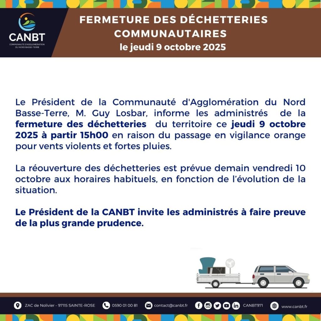 Le Président de la Communauté d’Agglomération du Nord Basse-Terre, M. Guy Losbar, informe les administrés de la fermeture des déchetteries du territoire ce jeudi 9 octobre 2025 à partir 15h00 en raison du passage en vigilance orange pour vents violents et fortes pluies.