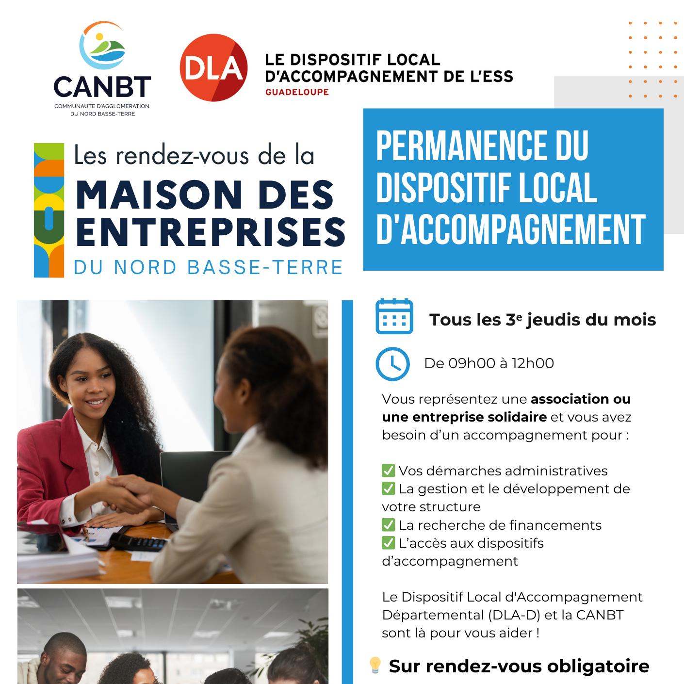 La Maison des Entreprises du Nord Basse-Terre vous donne rendez-vous de 9h ร  12h ร  Petit-Bourg, pour une permanence avec le Dispositif Local d’Accompagnement Dรฉpartemental (DLA-D). ๐Ÿ“…