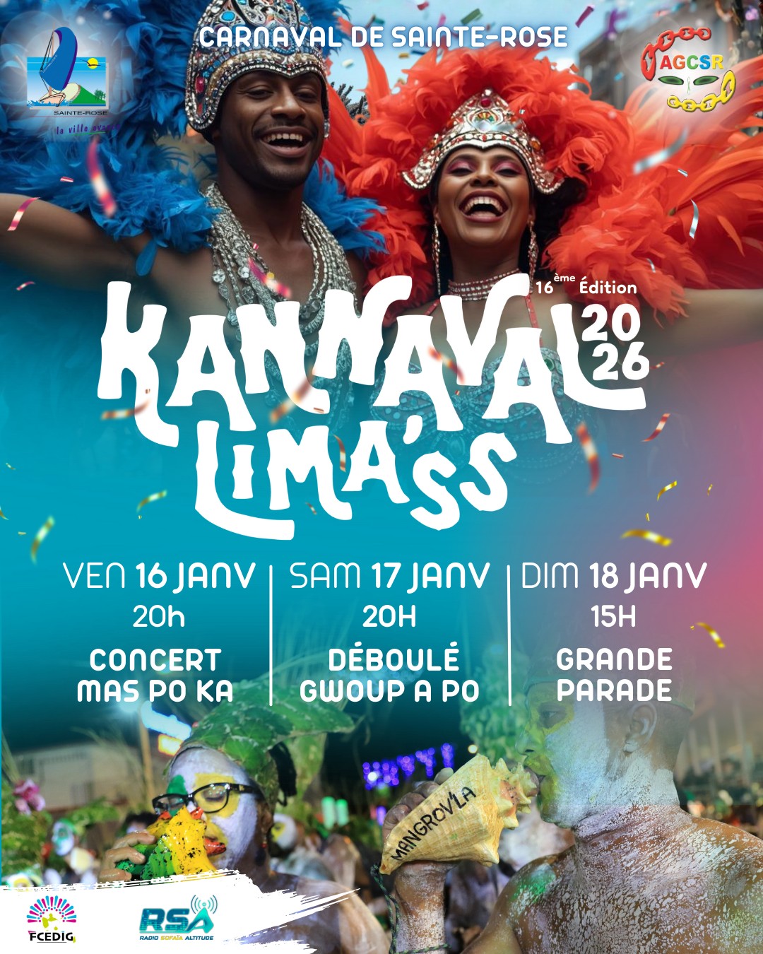 La Ville de Sainte-Rose et l’Association des groupes de carnaval de Sainte-Rose vous invitent au KANNAVAL LIMA’SS 2026 !